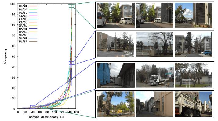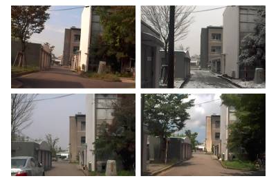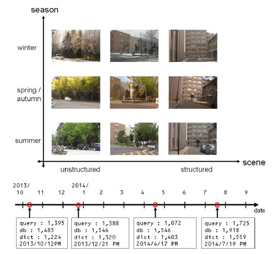 Fig. 1. Single-view cross-season place recognition. The appearance of a place may vary depending on geometric (e.g., viewpoint trajectories and object configuration) and photometric conditions (e.g., illumination).Such changes in appearance lead to difficulties in scene matching, and thereby increasing the requirement for a highly discriminative, compact scene descriptor. In this figure, the panels (top-left, top-right, bottom-left,bottom-right) shows visual images acquired in autumn (AU:2013/10), winter(WI:2013/12), spring (SP:2014/4), and summer (SU:2014/7), respectively.