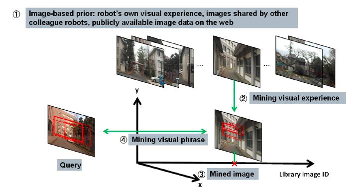 Fig. 2. System overview: proposing, verifying and retrieving landmarks for cross-season place recognition. The proposed framework consists of three distinct steps: (1) landmarks are proposed by patch-level saliency evaluation(red boxes in “Query”), (2) landmarks are verified by mining the image prior to find similar patterns (red boxes in “Mined image”), and (3) landmarks are retrieved by using the bag-of-bounding-boxes scene descriptors (colored boxes in the bottom figure).
