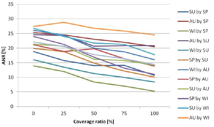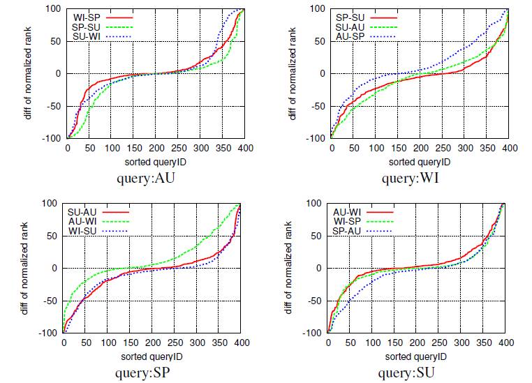Fig. 8. Comparison across seasons. Horizontal axis: sorted query ID.Vertical axis: difference of normalized ranks Δr=rS1?rS2 between different season databases. S1 and S2 are two different seasons indicated in the key(e.g., “WI-SP” indicates Δr = rWI ?rSP).
